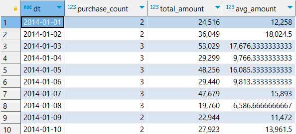 , sum(purchase_amount) AS total_amount -- 일일 총 매출